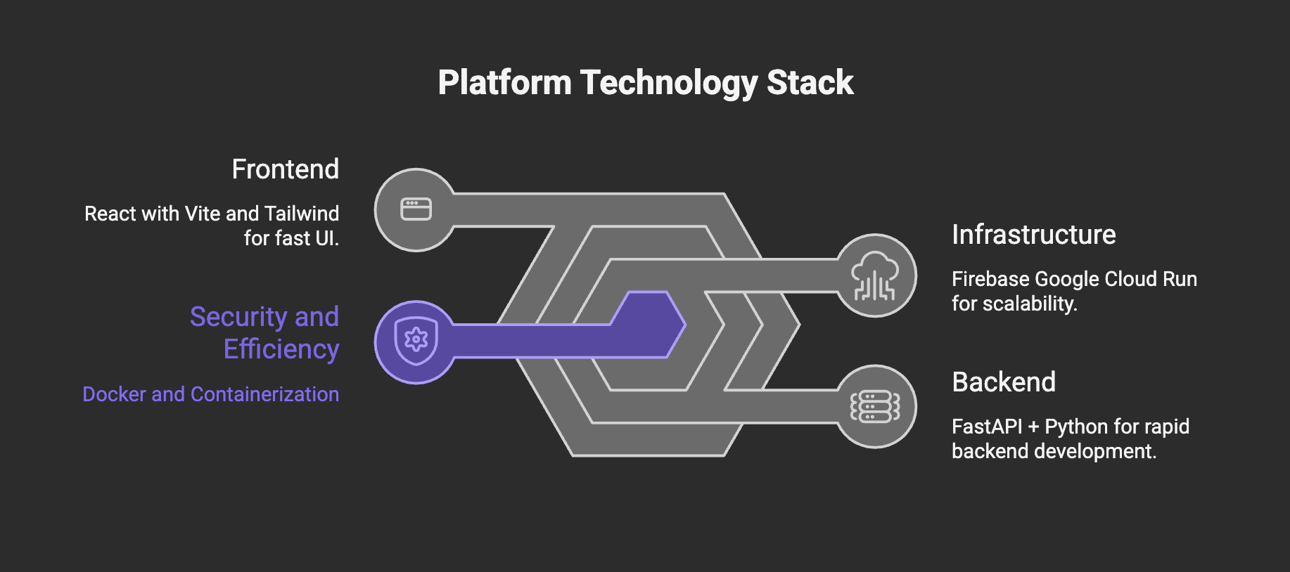 Under the hood, the platform runs on a stack built for speed, isolation, and low overhead. The frontend is React with Vite and Tailwind — fast to develop, fast to load. The backend is FastAPI with Python handling the REST API and all core ML logic. Infrastructure sits on Firebase for authentication and database, Docker for containerized code execution, and Google Cloud Run for serverless deployment. Every piece was chosen for a reason: keep it lean, keep it secure, and keep it cheap enough that a solo developer can actually run it in the early phases.